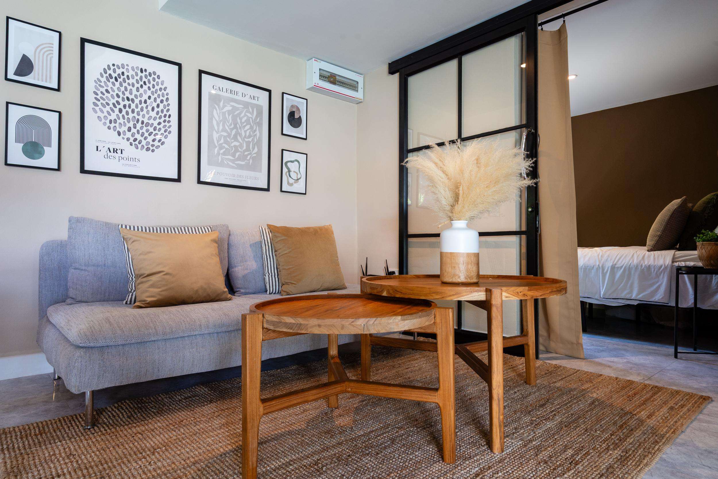 The living area is air-conditioned and features a comfortable sofa and coffee table, while the 120 sqm terrace and garden area provide the perfect spot for relaxing and soaking up the sun.