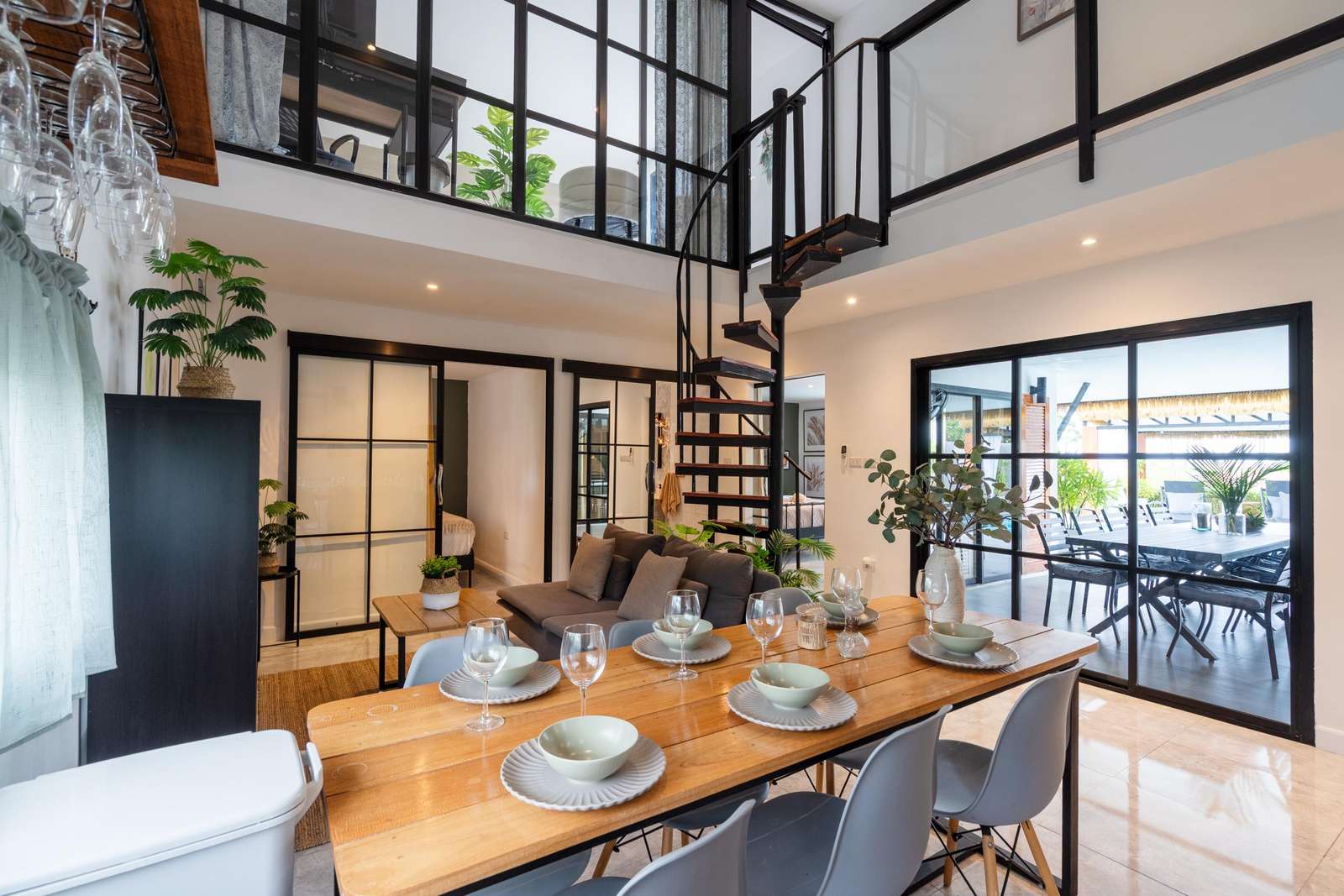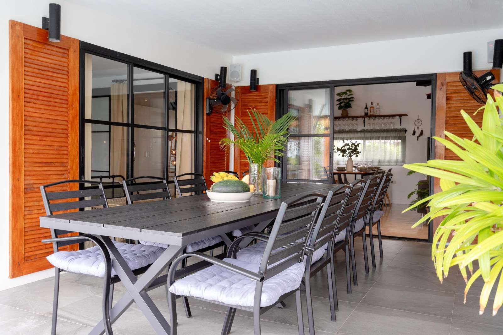 Dining table inside and another one outside by the pool
