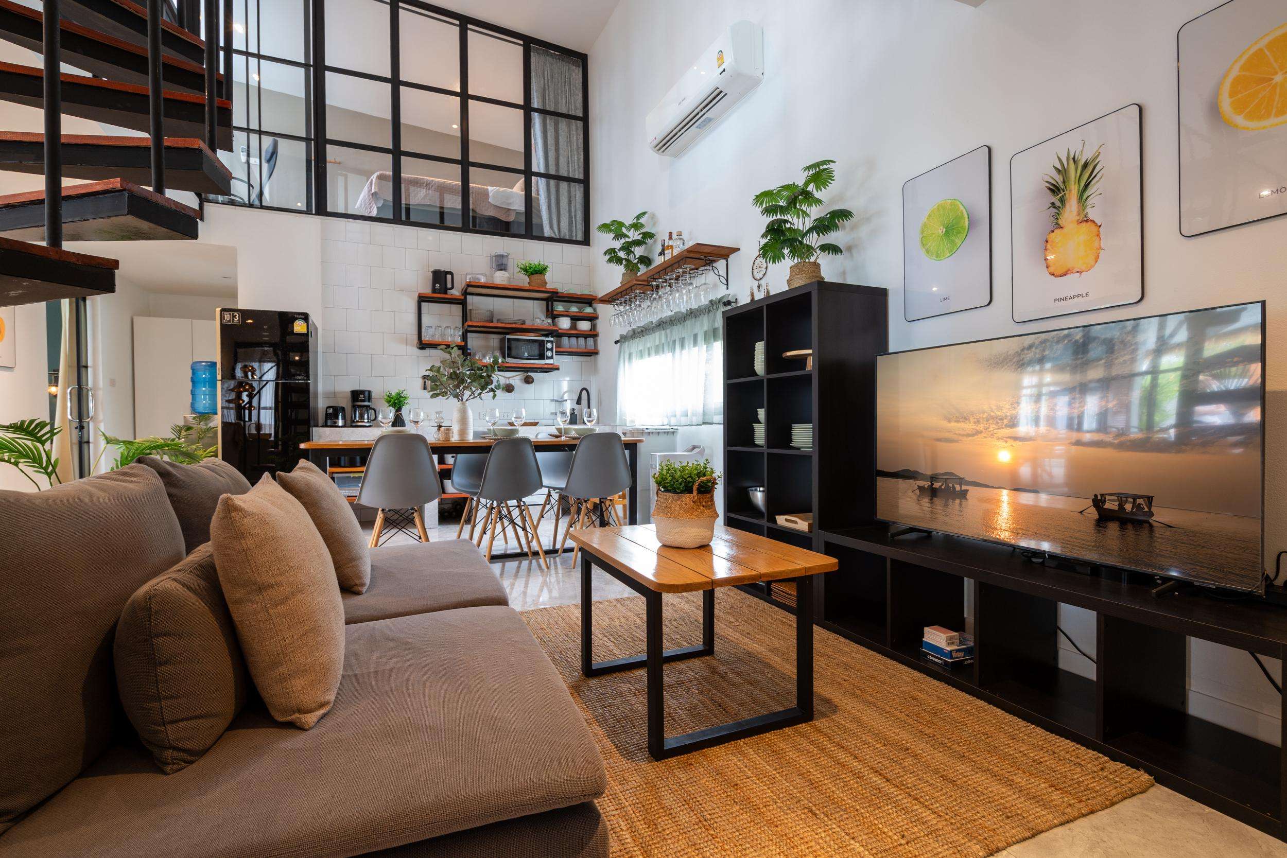 Adjacent to the kitchen/dining area you will find a sofa and TV
