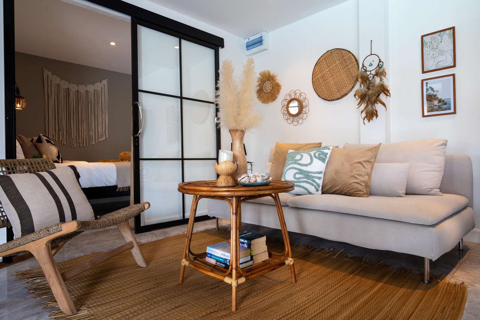 The living area is air conditioned with high ceiling. Comfortable sofa with coffee table.